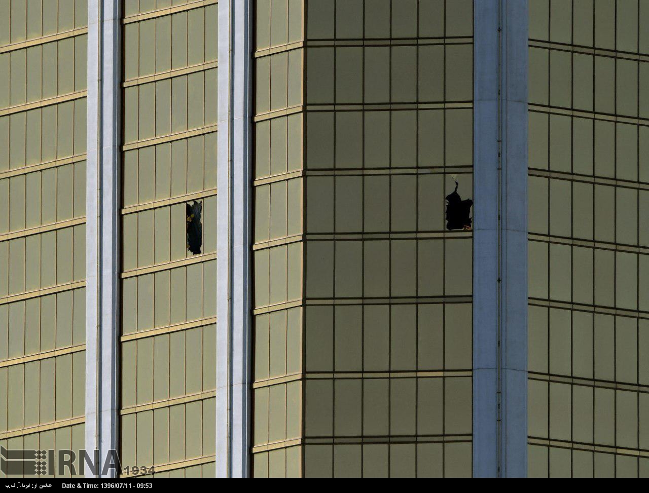 لاس و گاس – آمریکا / پنجره های آسیب دیده طبقه ۳۲ هتل «مندلی بی» ؛ محلی که مهاجم به سوی مردم آتش گشود.