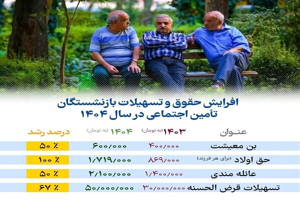 مدیرعامل سازمان تأمین اجتماعی با بیان اینکه در این جلسات مقرر شد افزایش حقوق پایه بازنشستگان طبق مصوبه شورای عالی کار انجام شود، افزود: بر اساس تصمیمات گرفتهشده، بن معیشت بازنشستگان با ۵۰ درصد افزایش، به ۶۰۰ هزار تومان میرسد. همچنین حق عائلهمندی نیز با ۵۰ درصد افزایش به دو میلیون و ۱۰۰ هزار تومان خواهد رسید. حق اولاد نیز با ۱۰۰ درصد افزایش، یک میلیون و ۷۱۹ هزار تومان (بهازای هر فرزند) خواهد شد.